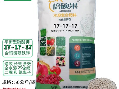 倍碩果17-17-17復合肥料,是一種可以全水溶的多元營養(yǎng)復合肥料,由優(yōu)質的氮磷鉀三種大量元素復配螯合態(tài)鈣鎂硼鐵鋅生產而成。產品具有全水溶,易吸收,營養(yǎng)全,肥料利用率高,使用安全方便等特點。肥料養(yǎng)分釋放平穩(wěn),速效兼長效。廣譜通用,適合大多數(shù)作物使用,科學合理施用能有效提高作物產量和品質。