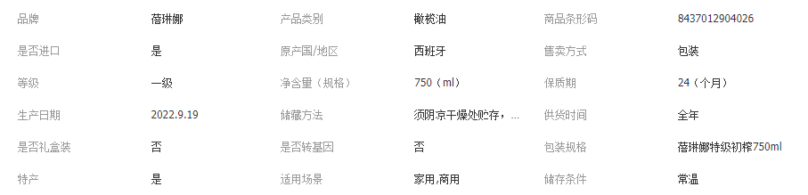 蓓琳娜西班牙原裝進(jìn)口特級初榨純橄欖油750ml輕食健身餐炒菜食用