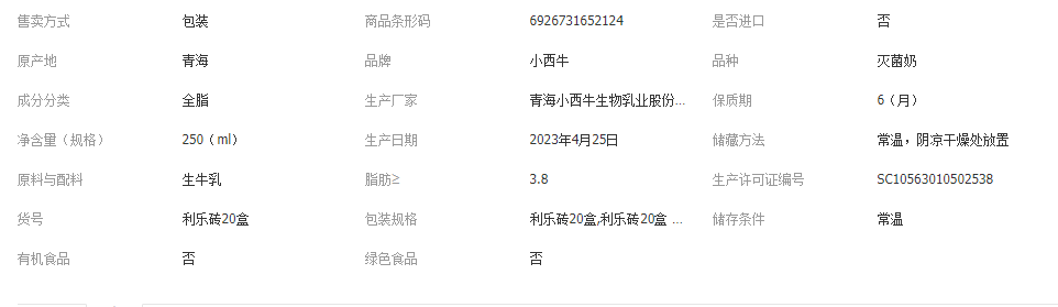 小西牛 青海純牛奶利樂(lè)磚高原奶新鮮牛奶量販裝250ml*20