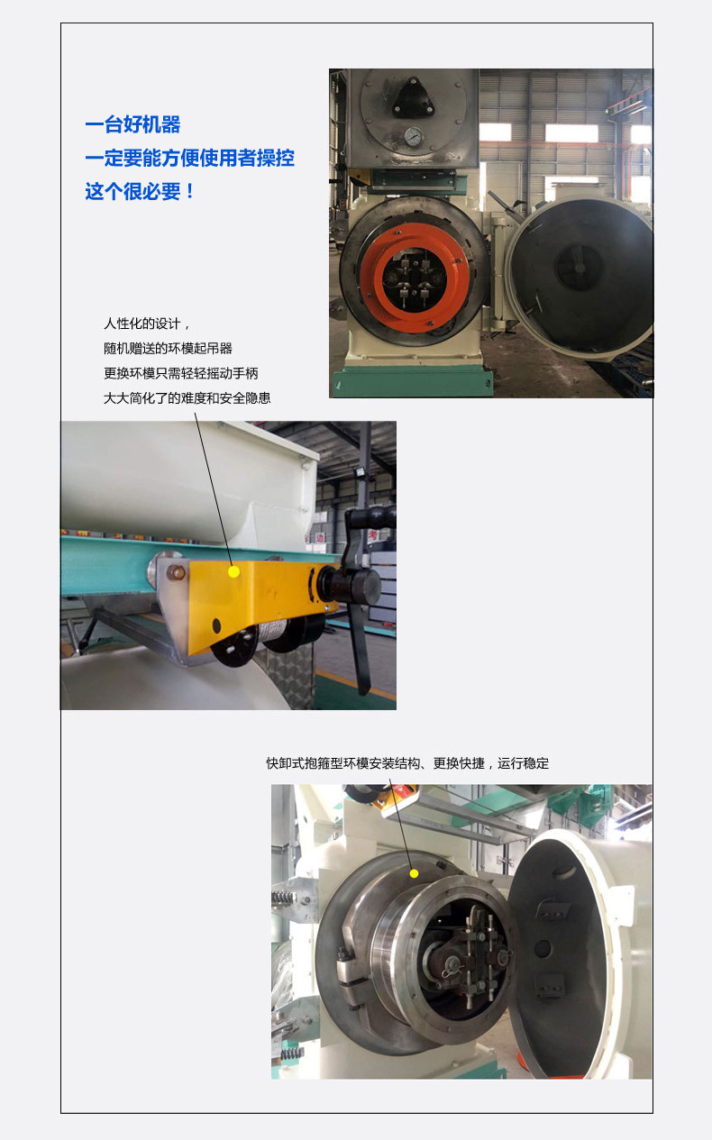 環(huán)模與傳動輪連接采用快卸式澆鑄抱箍,環(huán)模拆卸方便快捷(隨機贈送環(huán)模起吊器);