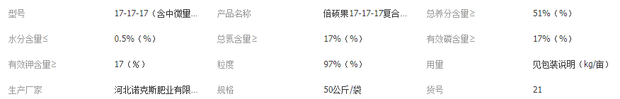 倍碩果17-17-17復(fù)合肥料,是一種可以全水溶的多元營(yíng)養(yǎng)復(fù)合肥料,由優(yōu)質(zhì)的氮磷鉀三種大量元素復(fù)配螯合態(tài)鈣鎂硼鐵鋅生產(chǎn)而成。產(chǎn)品具有全水溶,易吸收,營(yíng)養(yǎng)全,肥料利用率高,使用安全方便等特點(diǎn)。肥料養(yǎng)分釋放平穩(wěn),速效兼長(zhǎng)效。廣譜通用,適合大多數(shù)作物使用,科學(xué)合理施用能有效提高作物產(chǎn)量和品質(zhì)。